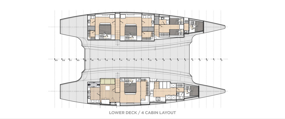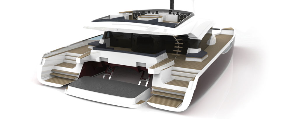 In the design particular emphasis has been given to the facility of movement aboard, particularly when moving between saloon and cockpit, cockpit and deck as well as between the deck and the tender via the large stern transoms. Large picture windows also ensure superb light and excellent visibility outside while the cabins are protected from the direct rays of the sun.