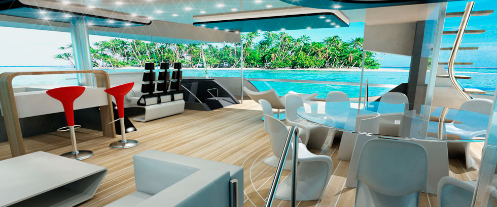 The majestic interior is extraordinarily spacious with a panoramic saloon, dining room and gourmet galley and a choice of other areas for relaxation.