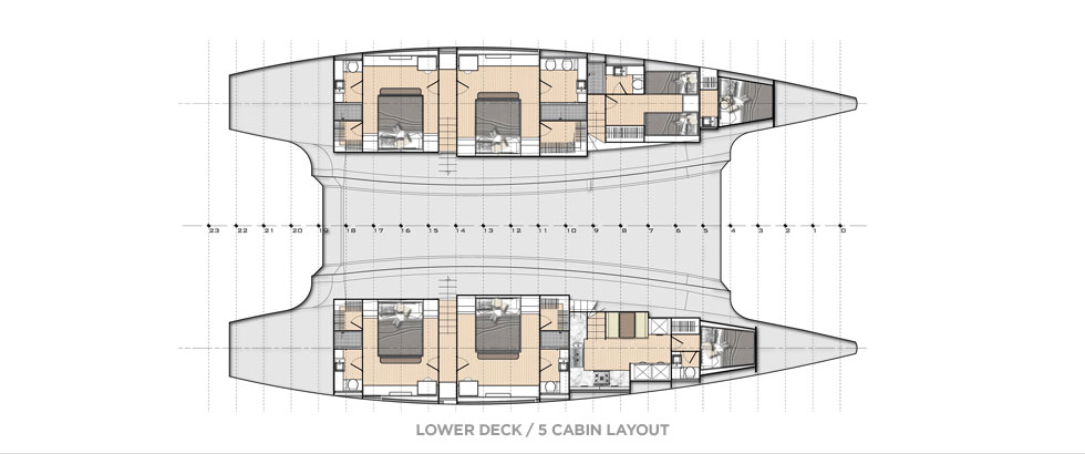 The Baroness-765 combines the ingredients for high performance, livaboard comfort and rugged durability into a seaworthy, attractive, package. She was designed to sail, not sit at the dock. Her hulls are long and lean, the bridge deck is well aft and high off the water to minimize slamming when sailing in rough conditions. The mast is within easy reach of the secure cockpit for easy single handing, and the enclosed wheel house will make you wonder why you ever went cruising without a protected watch keeping station.