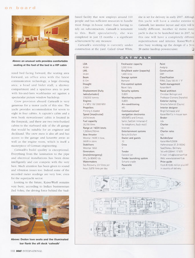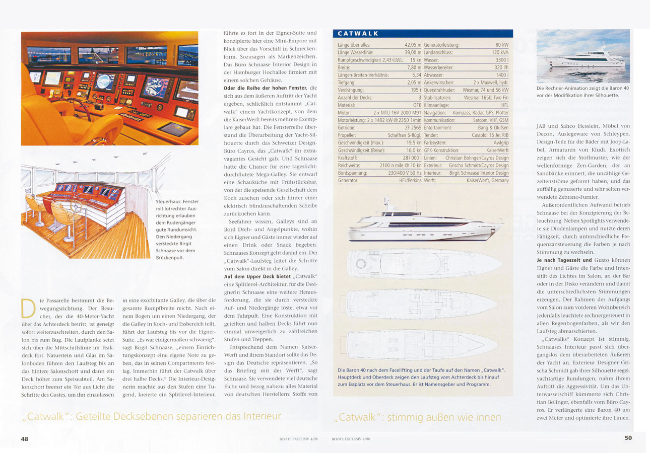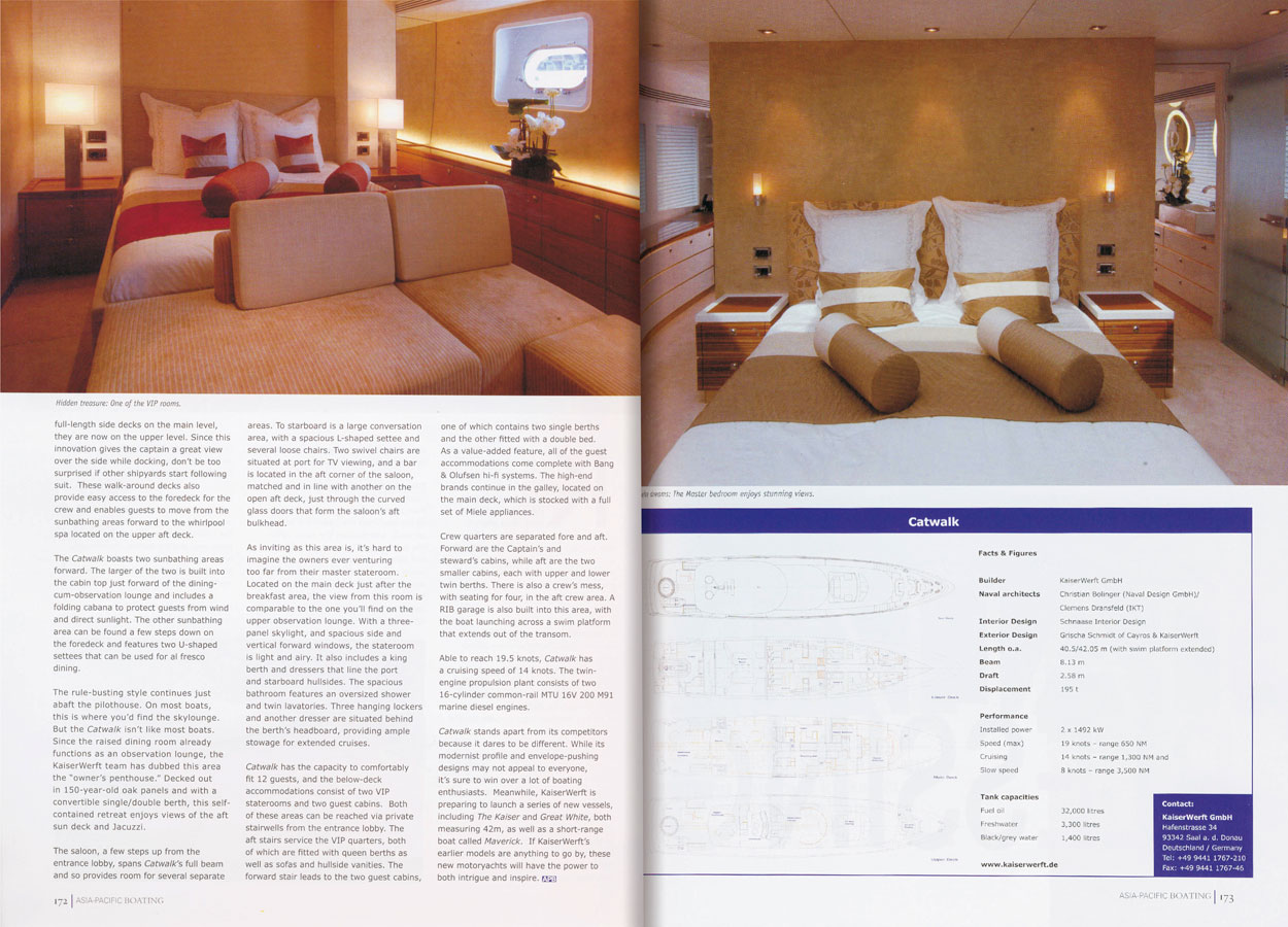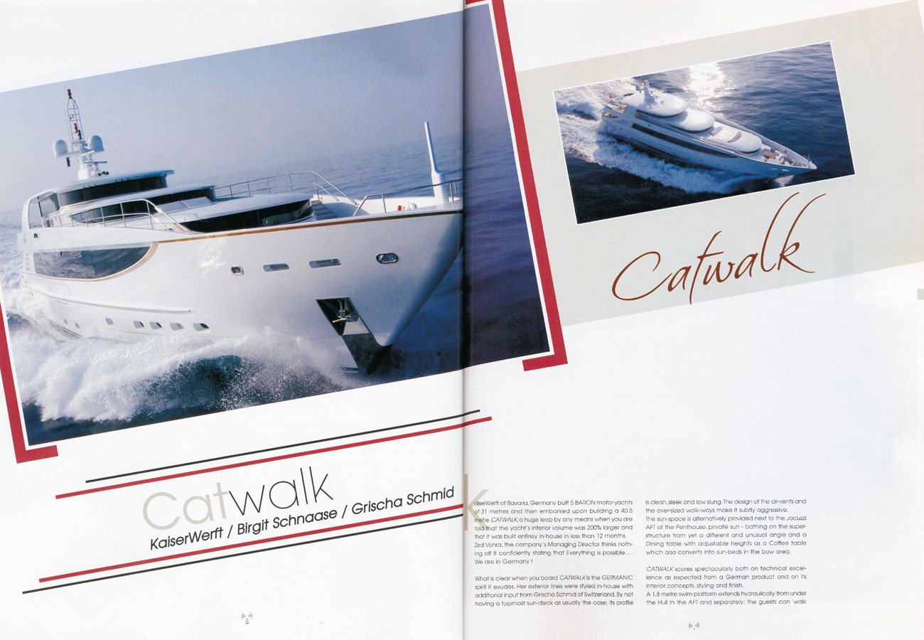 KaiserWerft of Bavaria, Germany built 5 Baron motor-yachts of 31 meters and then embarked upon building a 40.5 meter Catwalk, a huge leap by any means when you are told that the yacht's interior volume was 200% larger and that it was built entirely in-house in less than 12 months.
