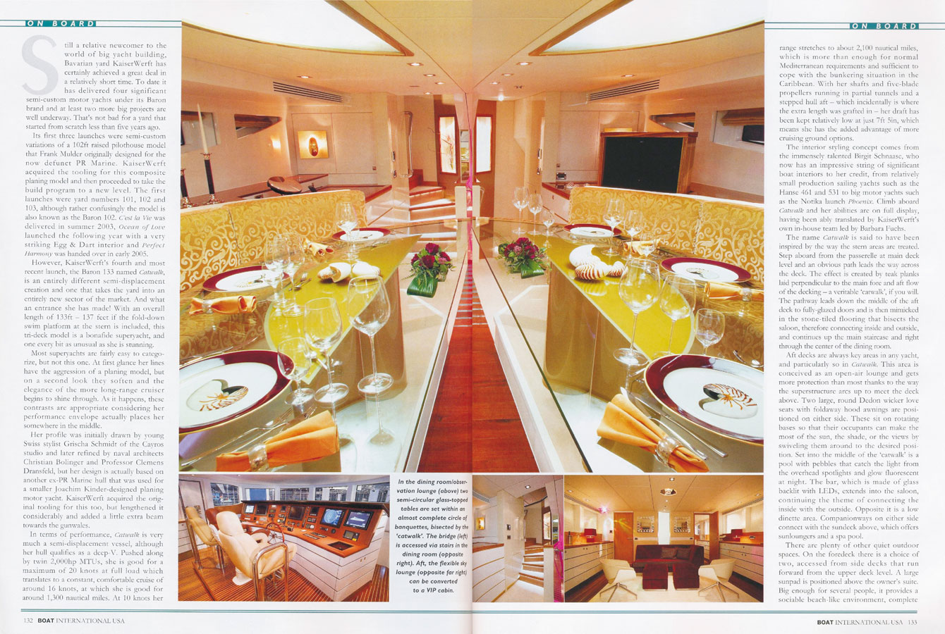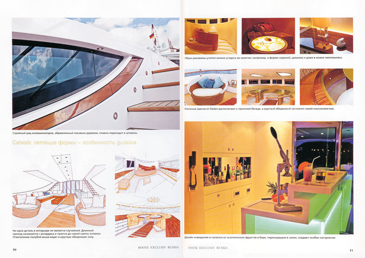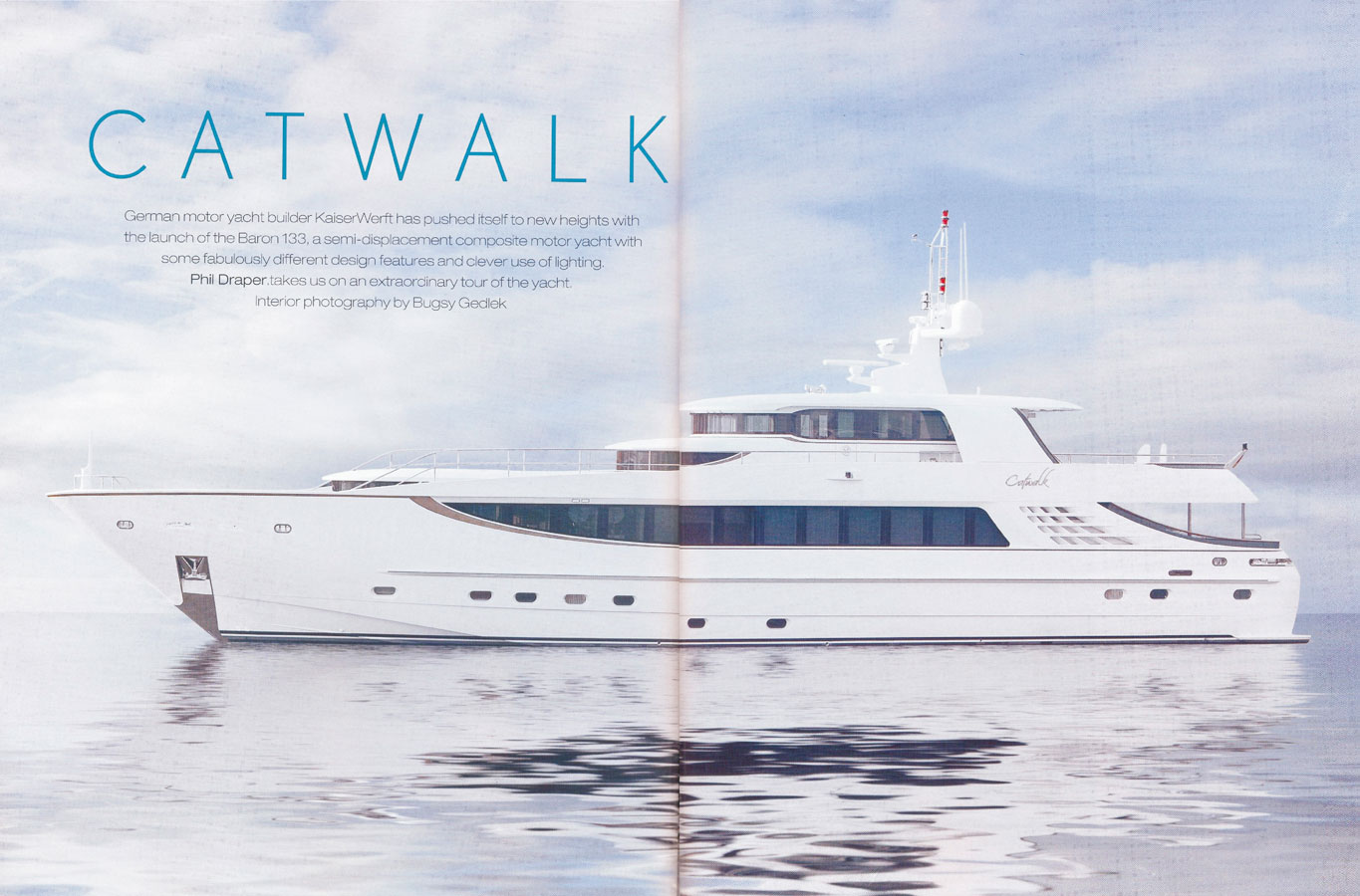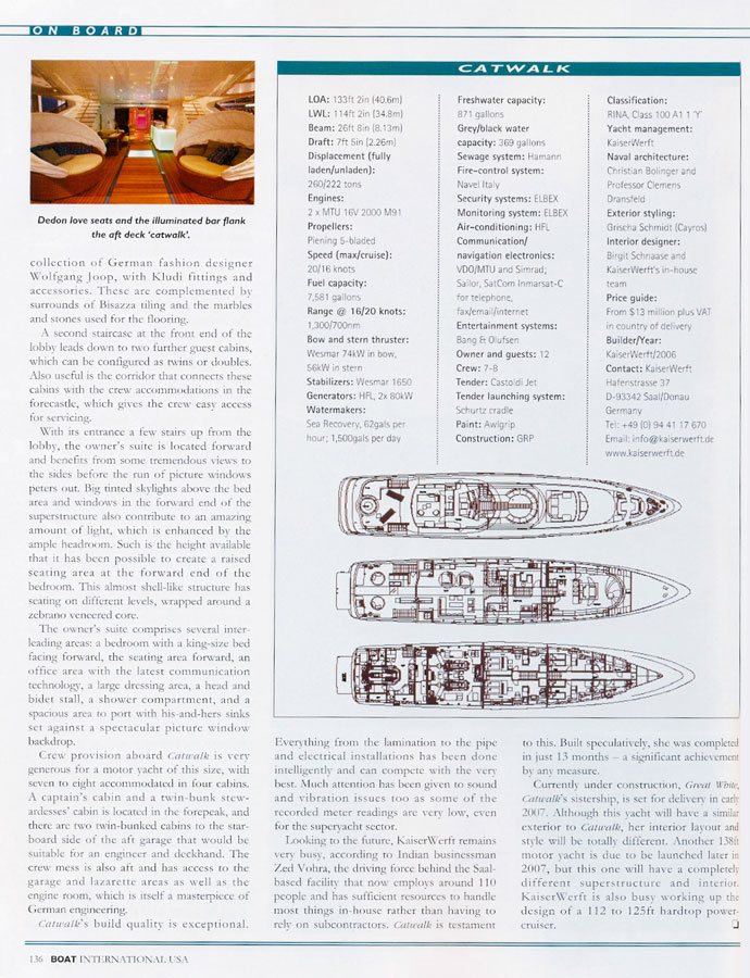 "Catwalk" is the name of distinctive new luxury yacht manufactured by KaiserWerft AG Swiss as part of Baron series. Measuring 40,6 meters in length, its most distinguishing feature is mirrored in its name. An illuminated catwalk extends from the exterior deck through the salon in the dining room. The saloon which takes up the full breadth of the yacht features large windows and stucco lustro walls three meters high. -Author Adrien Colombo