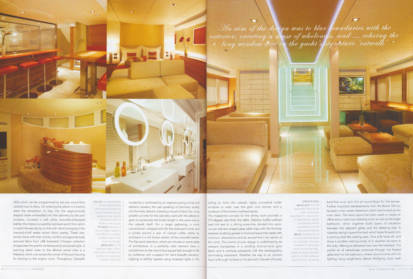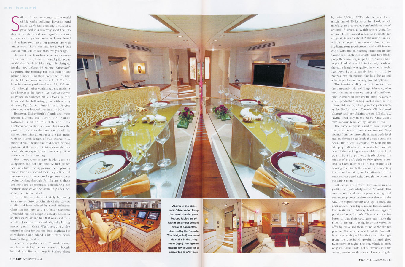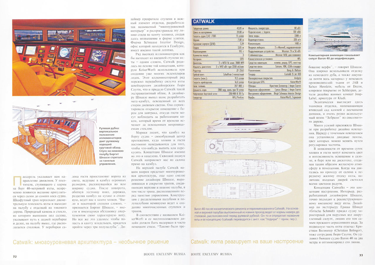 "Catwalk" is the name of distinctive new luxury yacht manufactured by KaiserWerft AG Swiss as part of Baron series. Measuring 40,6 meters in length, its most distinguishing feature is mirrored in its name. An illuminated catwalk extends from the exterior deck through the salon in the dining room. The saloon which takes up the full breadth of the yacht features large windows and stucco lustro walls three meters high. -Author Adrien Colombo