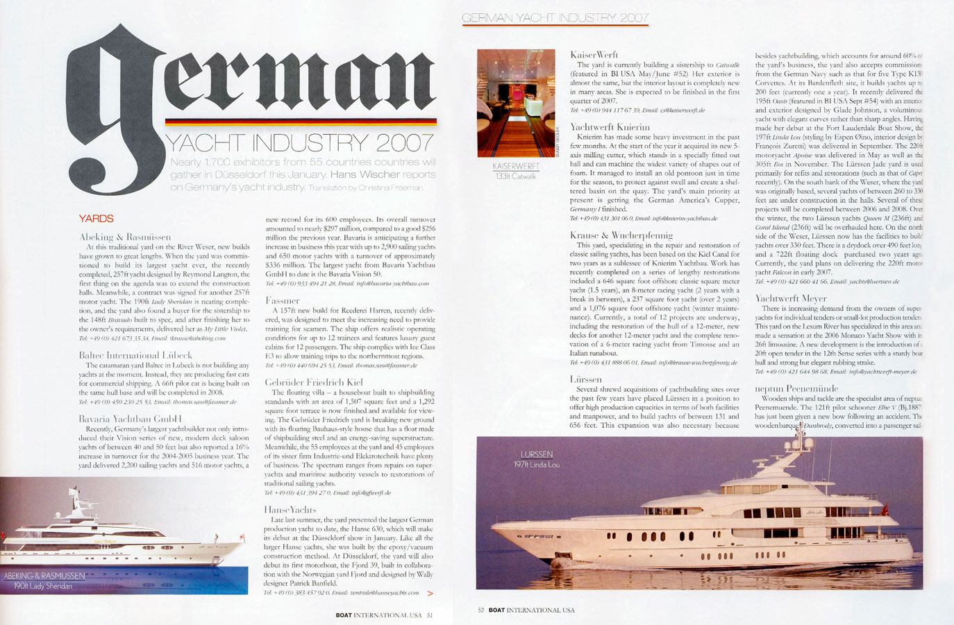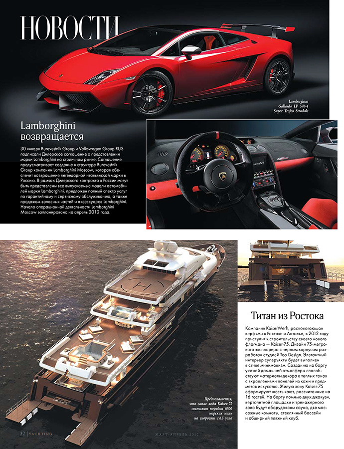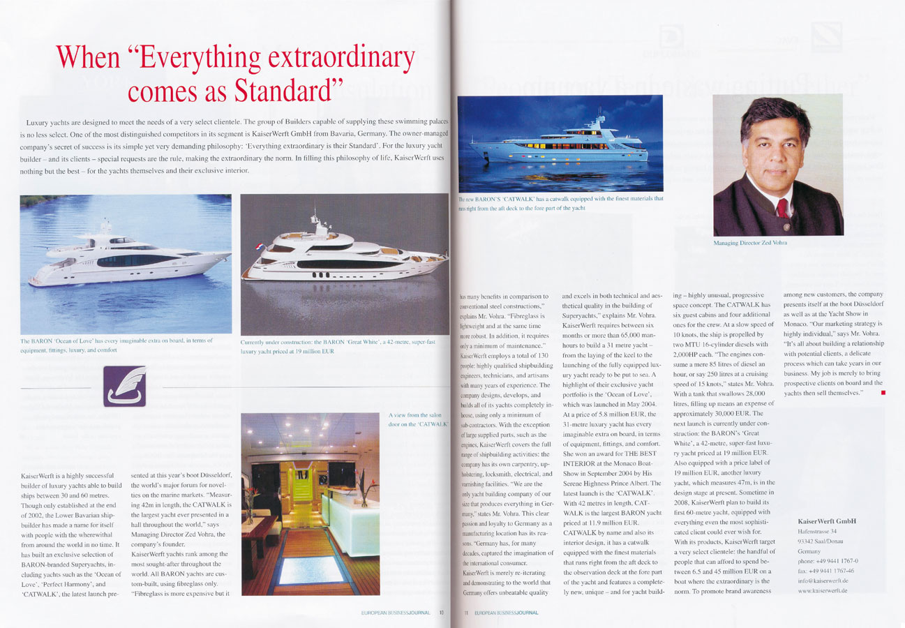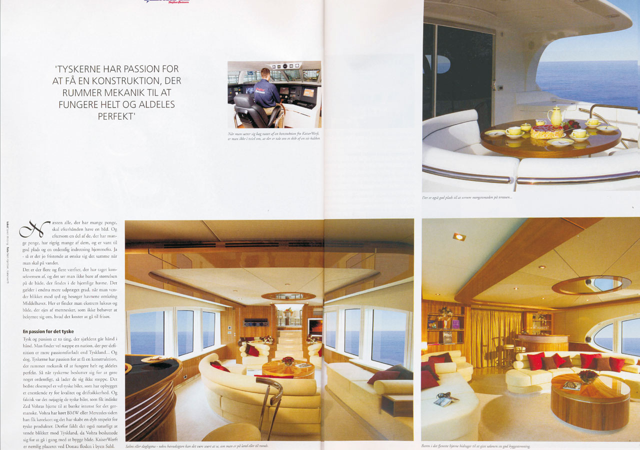 Luxury yachts are designed to meet the needs of a very select clientele. The group of Builders capable of supplying these swimming palaces is no less select. One of the most distinguished competitors in its segment is KaiserWerft AG Swiss from Bavaria, Germany. The owned-managed company's secret of success is its simple yet vert demanding philosophy: "Everything extraordinary is their Standard.