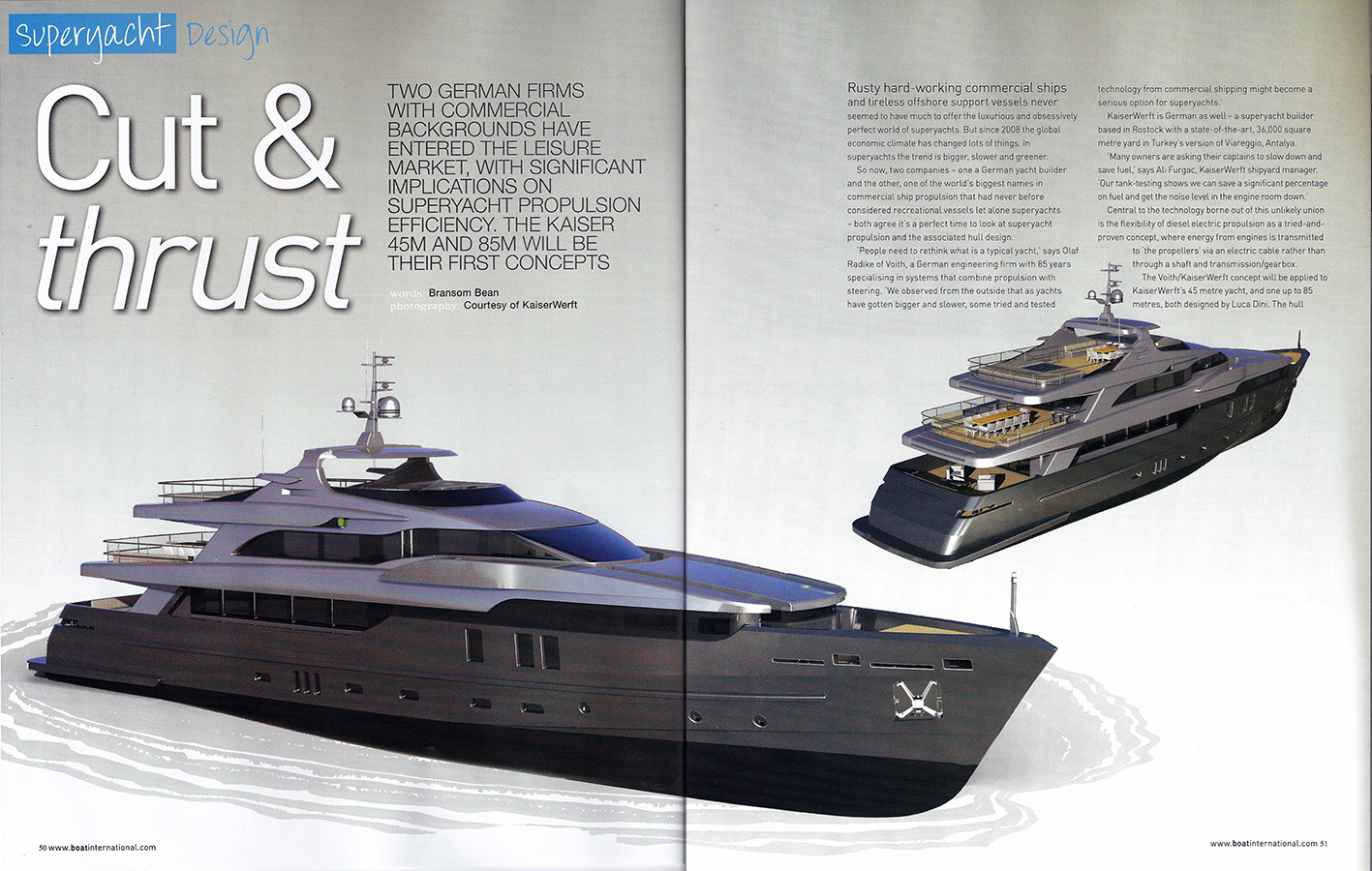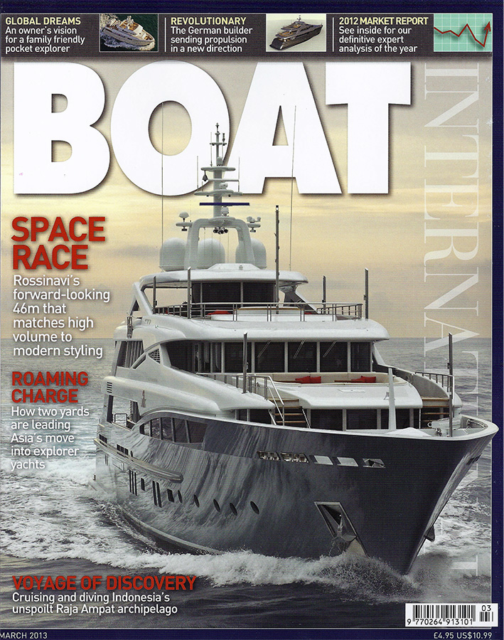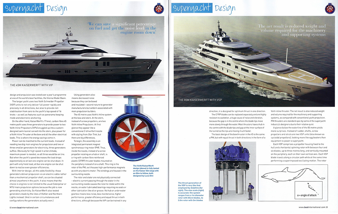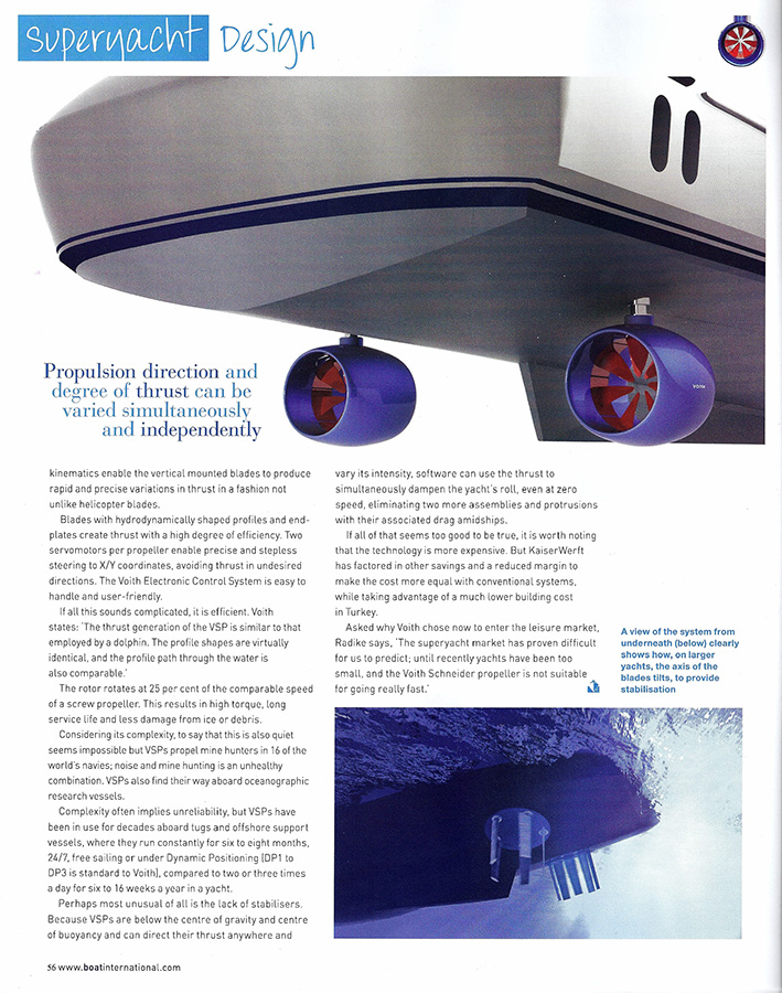 The project is more than promising. Tank tests performed at the University of Vienna in Austria have shown significantly reduced fuel consumption, about 40% at 16.5knots. Another advantage is that the Voith unit, which includes sturdy and light carbon rotor blades driven by an integrated permanent magnetic ring motor directly connected to the vessel’s generator, creates much fewer vibrations and noise. Generators can easily be insulated in a dedicated room for further sound-dampening and greater onboard comfort. Another great benefit is that the whole unit is compact, allowing designers to dedicate more space to interior accommodations Voith’s inline thrusters and propulsions, extensively tested on ships of all kinds, have shown to provide excellent control for forward and side motion as well as dynamic positioning, allowing the captain to keep the vessel in the same position without the use of anchors. Environmentally sensitive yacht owners will also appreciate the fact that the units use water rather than oil as lubricant, minimizing the risk of damaging leaks.