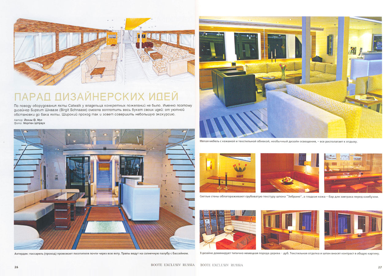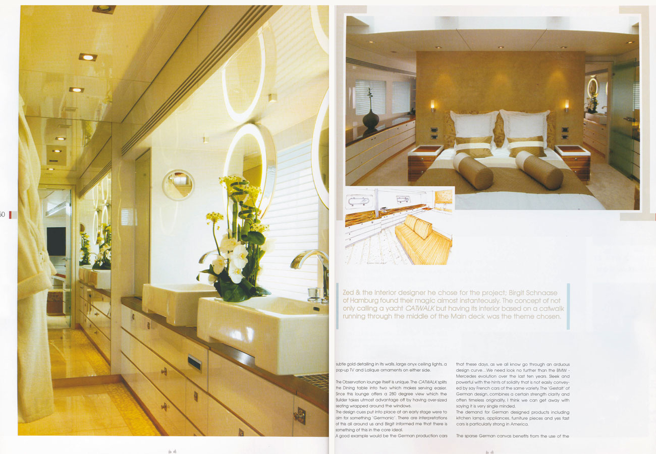 "We have been closely working with KaiserWerft shipyard on the complete interior design of motor yacht Catwalk. A dedicated and skilled team with an open mind to our ideas and ready to implement these to a quality end product" says the famous designer Birgit Schnaase about the yard team.