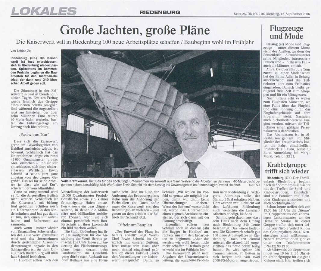 Despite a difficult year one would hope that with new investment, and 20 years of yacht building experience behind them, the yard will be able to look forward with optimism. KaiserWerft say that with their new financing they will now be able to "introduce and speed up new production, to support clients and dealers and to develop new sales channels.", stating that they will avoid repeating the mistakes of the past. Also on the agenda of the yard's new owners is increased co-operation with internationally renowned superyacht designers in order to develop a new range of sail and motoryachts.