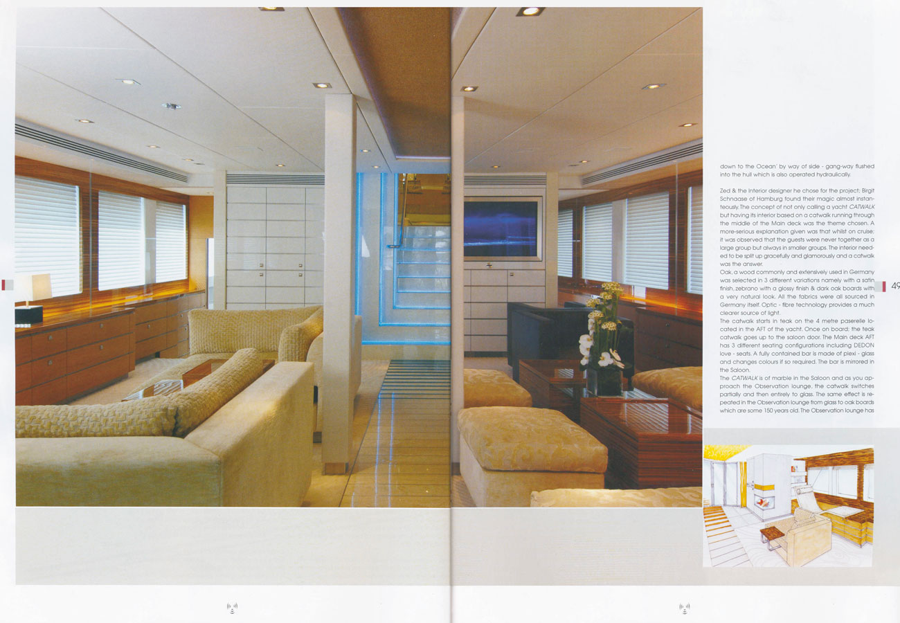 Made by KaiserWerft, loved by the World. A superyacht that merits a category of her own. It exceeds every expectation of luxury, design, engineering and craftmanship. KaiserWerft’s legendary 40 meter yacht Catwalk is nominated as Best Yacht of the World. In January 2006, Kaiserwerft launched Catwalk, a very unique semi-displacement 40.5-meter yacht that extends to 42 meters by way of a swim platform and 8.1 m wide. The name Catwalk is based on its interior design concept, stucco walls and fabrics in harmony with Oak and African zebrawood, having both a polished and satin finish, grace the yacht. Catwalk has been built in-house to the high standards of quality and finish as expected from a German Shipyard. The yacht benefits from unusually high ceilings especially in the entrance lobby, which also incorporates a lounging area with 3-meter ceilings.