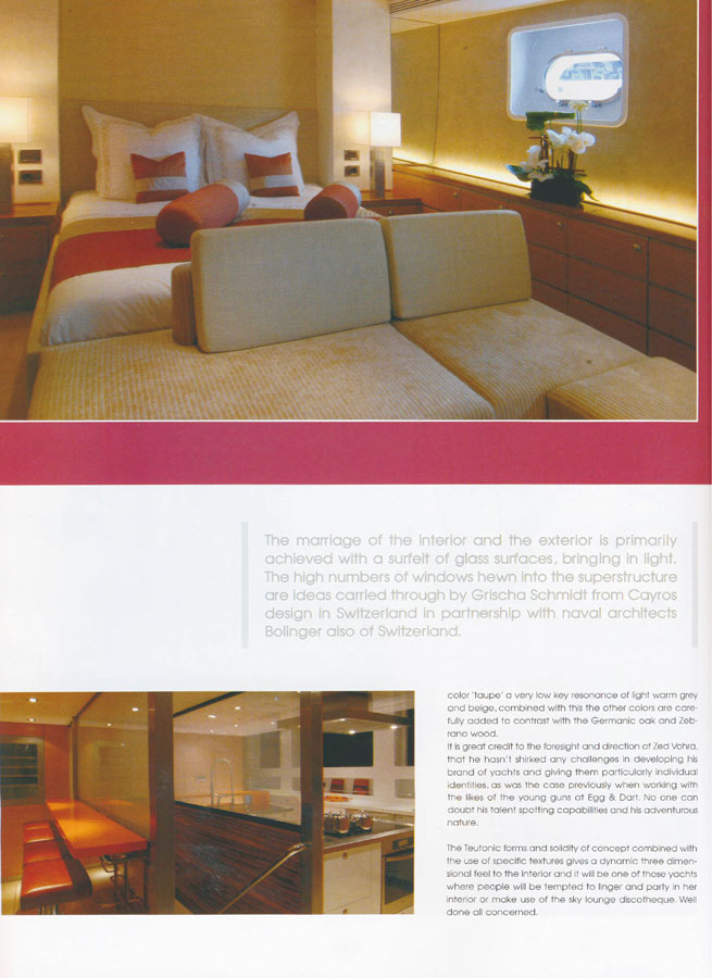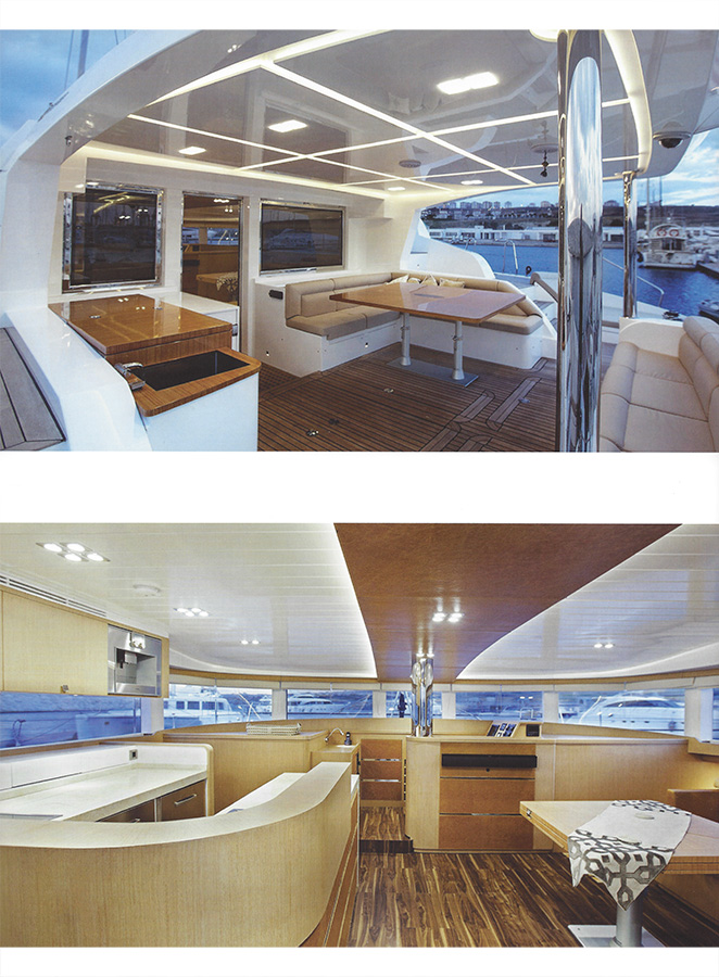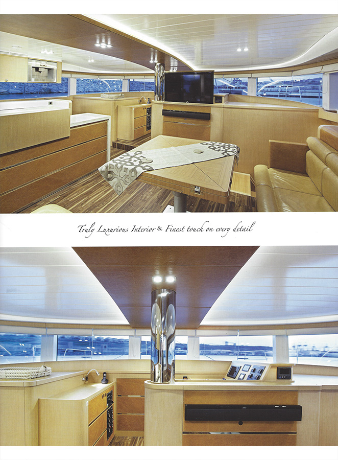Gli interni sono ovviamente personalizzati da ogni singolo armatore. A trionfare è la luce garantita dalle grandi vetrate cielo/terra – o meglio – cielo/mare. Non solo i saloni ma anche le cabine – tutte disposte ai ponti superiori – sono contraddistinte da grandi vetrate.